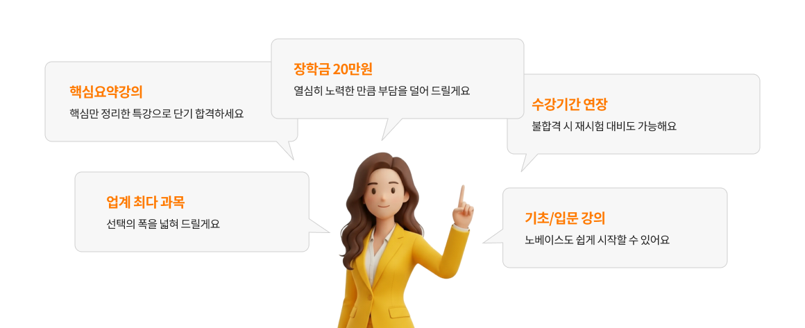 * 입문특강은 노베이스 수험생을 위해 정규 강의 외에 특별 제공되는 강의입니다. * 파이널 특강은 시험 직전, 취약한 부분을 빠르게 보완하고 출제 가능성이 높은 핵심 테마를 집중 점검할 수 있도록 정규 강의 외에 추가 제공되는 강의입니다. * 커리큘럼은 상황에 따라 유동적으로 변경될 수 있습니다.